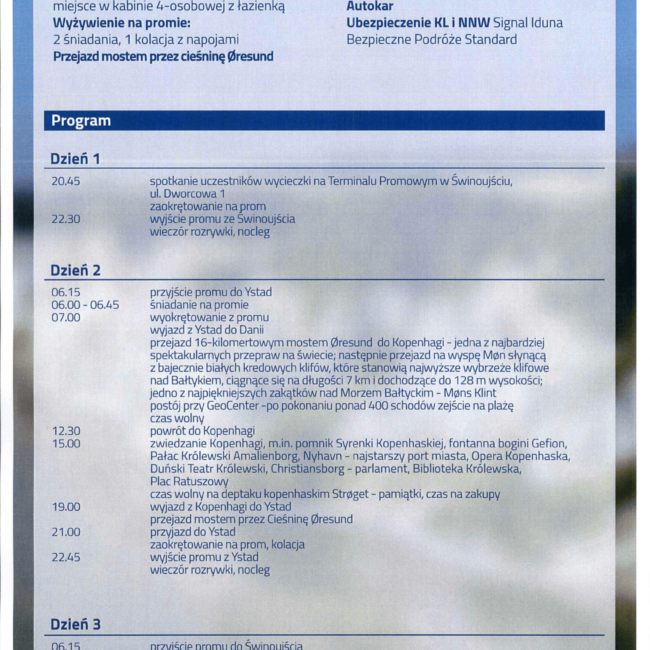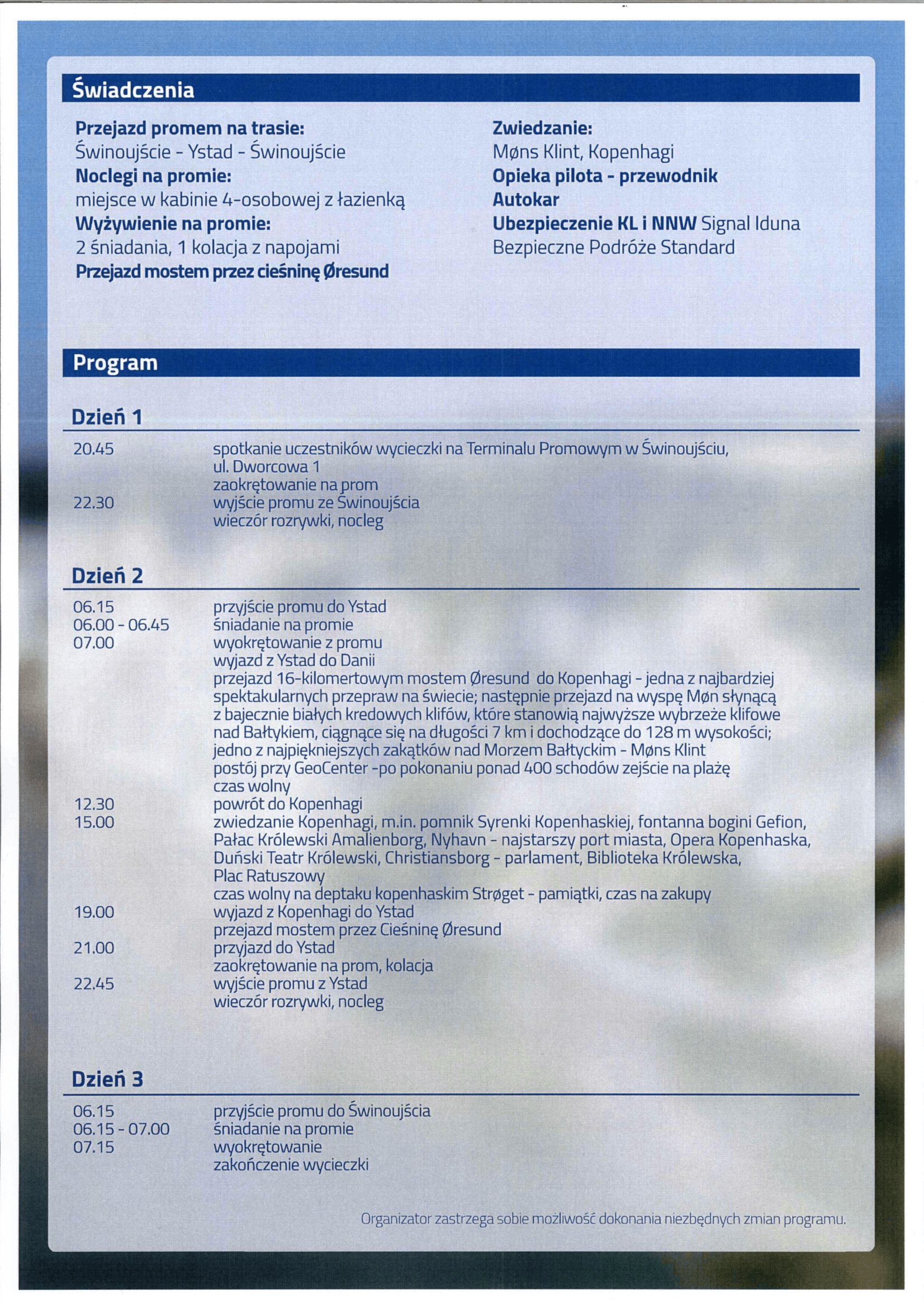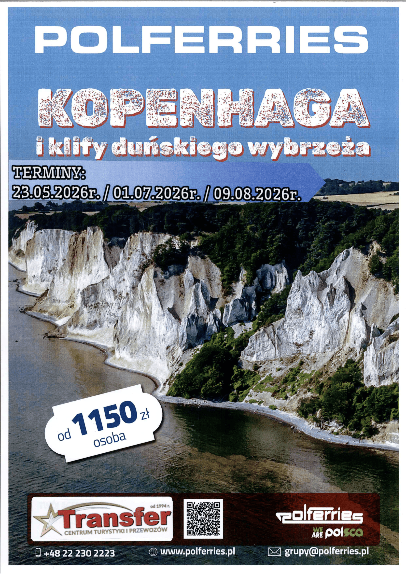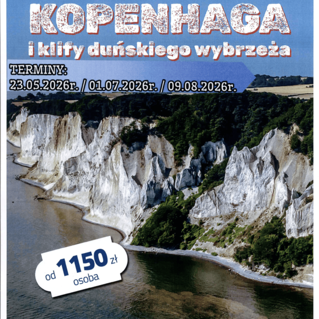Klify duńskiego wybrzeża – najwyższe wybrzeże klifowe nad Bałtykiem, majestatyczne, potężne a zarazem budzące szacunek. Miejsce zachwyca szmaragdowym kolorem Bałtyku, bielą skał i żywą zielenią gęstego bukowego lasu, który porasta okoliczne wzgórza. Kopenhaga – „Port Kupców” stolica Danii, od 1443 r. do dnia dzisiejszego siedziba duńskiej monarchii. Pełna radości życia i oryginalnej architektury metropolia a zarazem historyczna oaza. Fascynujące i wspaniałe miasto, zarówno na krótki weekend jak i wakacje bez względu na porę roku, gust i wiek odwiedzających.