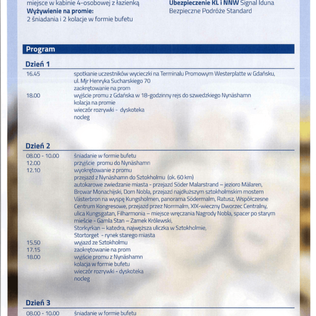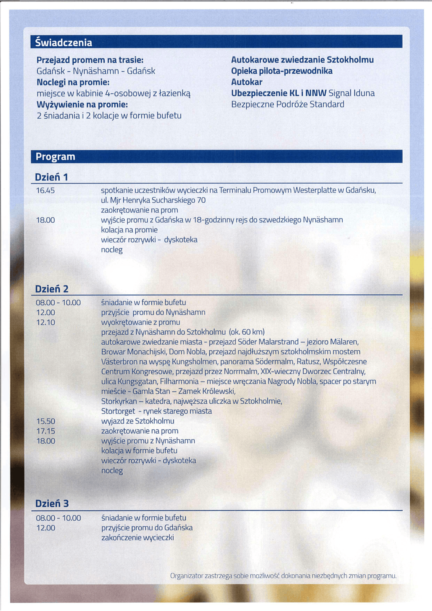 • przejazd promem na trasie Gdańsk – Nynäshamn – Gdańsk